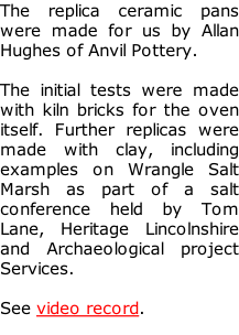 We have developed a number of test firings of replica salt pans based on a set of cermic pans discovered at Ingoldmells beach, Linconshire.